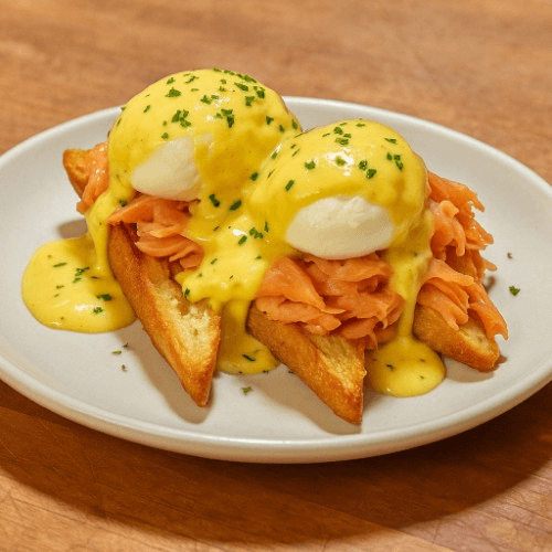 2 poached eggs on baguette toast, smoked salmon, and hollandaise sauce