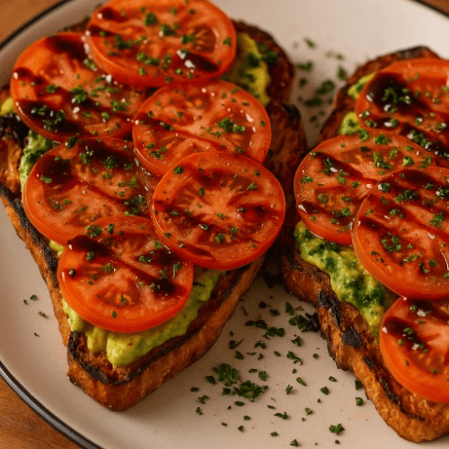 Avocado topped with cherry tomatoes, parsley, & a balsamic glaze on toasted croissant