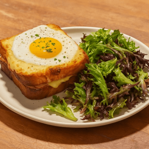Ham/ Swiss cheese / béchamel sauce / toasted brioche bread With sunny egg on top
