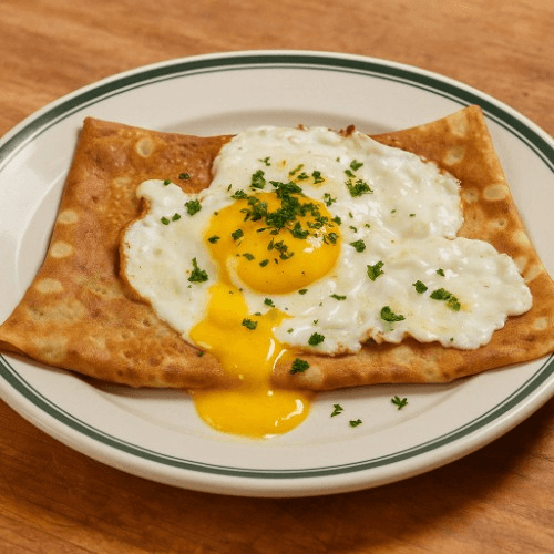 Ham, Spinach, Swiss Cheese, Smoked Gouda inside a crepe topped with sunny side egg